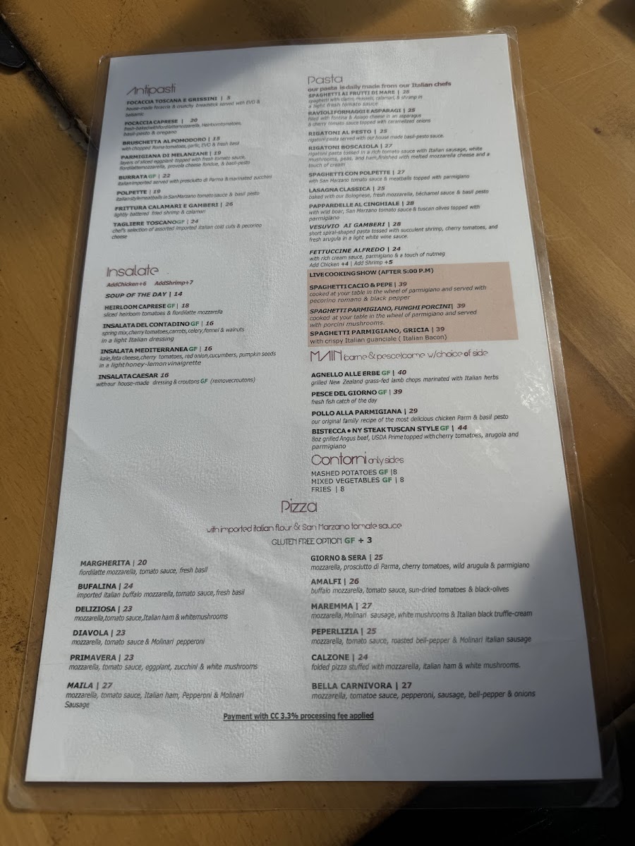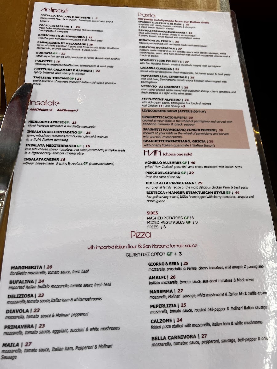 - Pappardelle al Cinghiale - Savor the rich flavors of wild boar, complemented by a tangy tomato sauce and Tuscan olives for US$25.